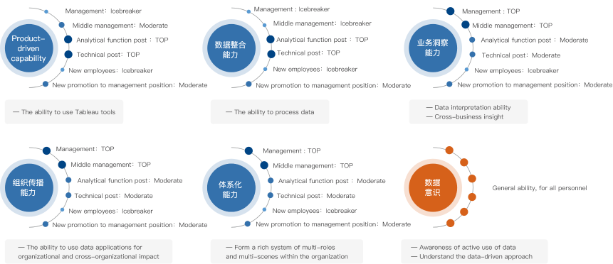 全面提升企业数据素养,关键是要因人而异、因组织而设计。面向全员构建主动使用数据的意识,了解数据驱动的方式,按照不同管理层级和角色来构建敏捷分析能力、数据整合能力、业务洞察能力、组织传播能力和体系化能力。