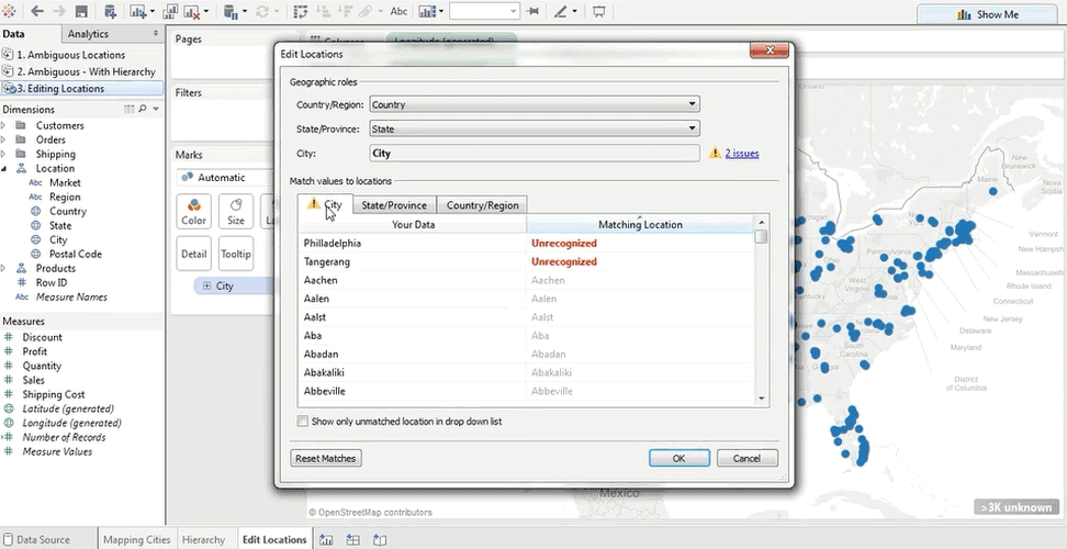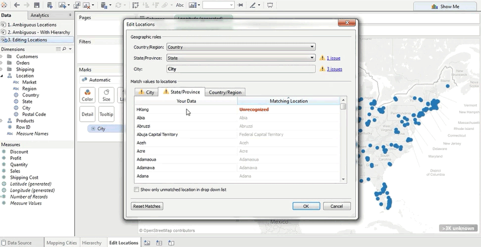 如果我们在州选项卡上,可以看到无法识别的值,这是非标准缩写。我们单击匹配位置列中的框,并开始输入正确的地名:Hong Kong,然后我们将选择正确的选项。