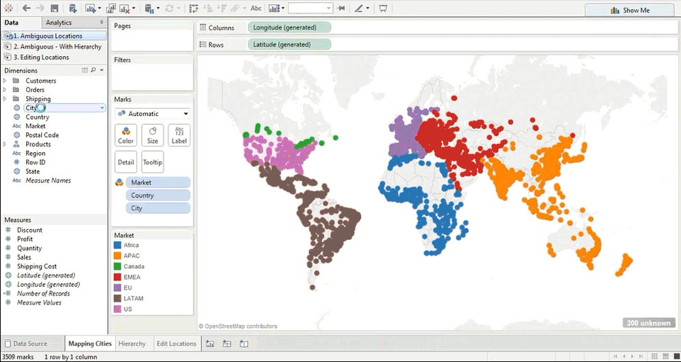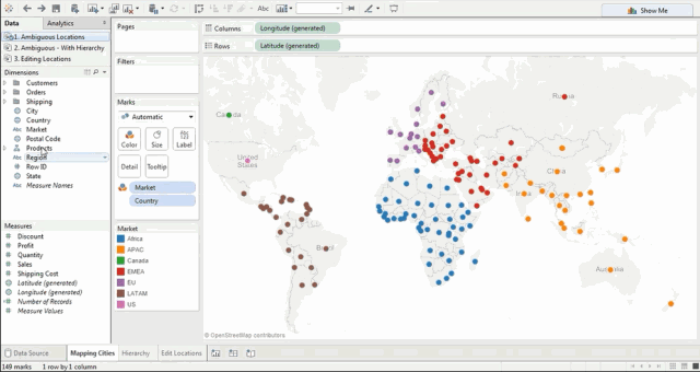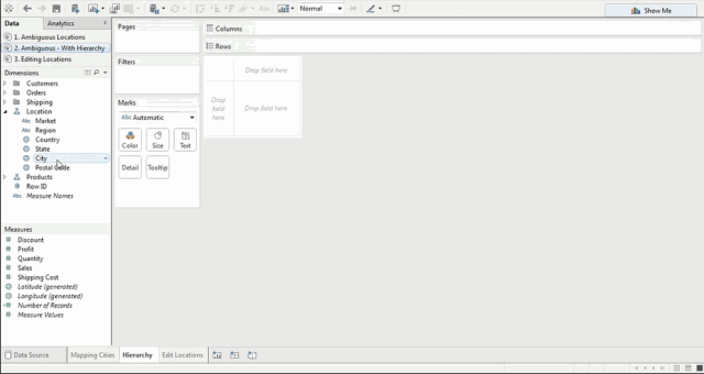 如果数据窗格中有分层结构,Tableau 将自动使用相应的分层结构级别来解决歧义。这里请注意,我们只绘制了城市,但是,这还自动引入了州和国家地区,并且没有未知指示符。