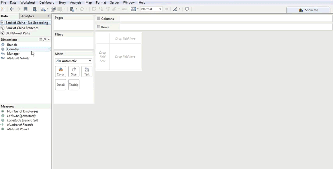 无论我们使用的是哪个数据集,只要分支机构的名称相同,Tableau 都能够进行映射。这里我们将连接到一些有关员工数量和管理人员的简单虚拟数据信息,其中没有地理数据,但是有国家地区和分支机构名称。