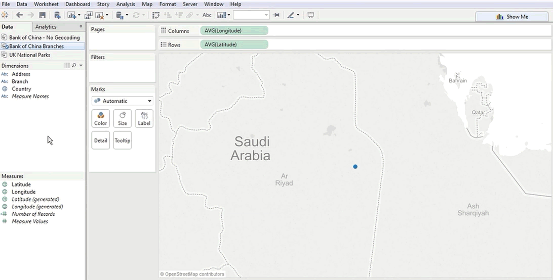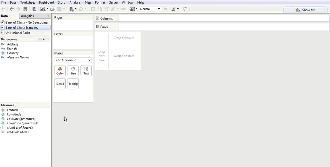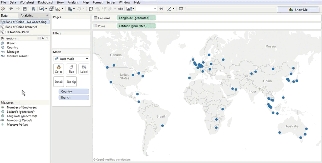 可展开 Tableau 的映射功能,并将数据映射到自动可用范围之外。例如,我们想要查看中国银行的全球分支机构,则可使用坐标数据进行映射。如果我们的数据中包含纬度和经度坐标信息,那就足够了。