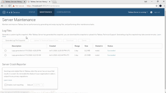 现在,让我们大概了解一下 GUI (图形用户界面)。顶部有三个选项卡,分别是状态、维护和配置。最右边是用于停止和启动 Tableau Server 的菜单。