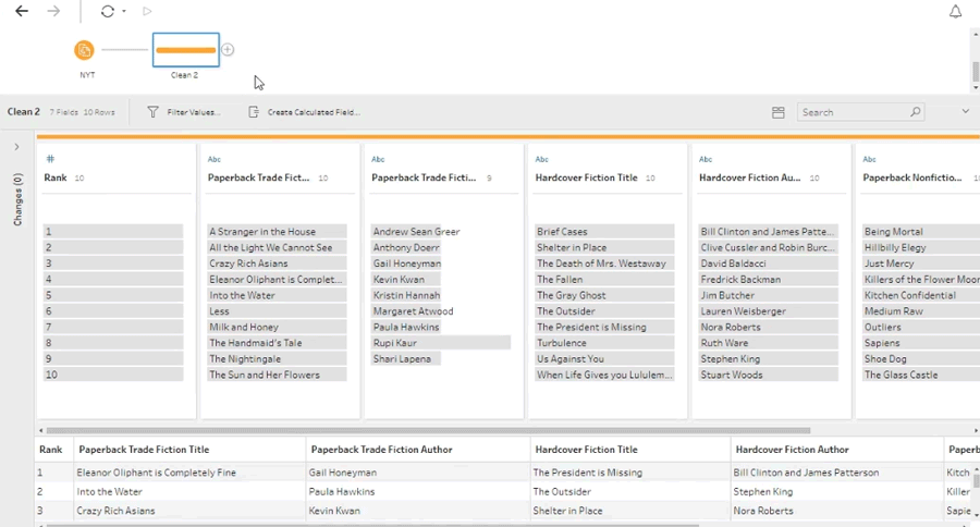 这里有另一个结构不同的数据集。每个畅销书列表有两列数据,一列是作者( Author )的,一列是书名( Title )。