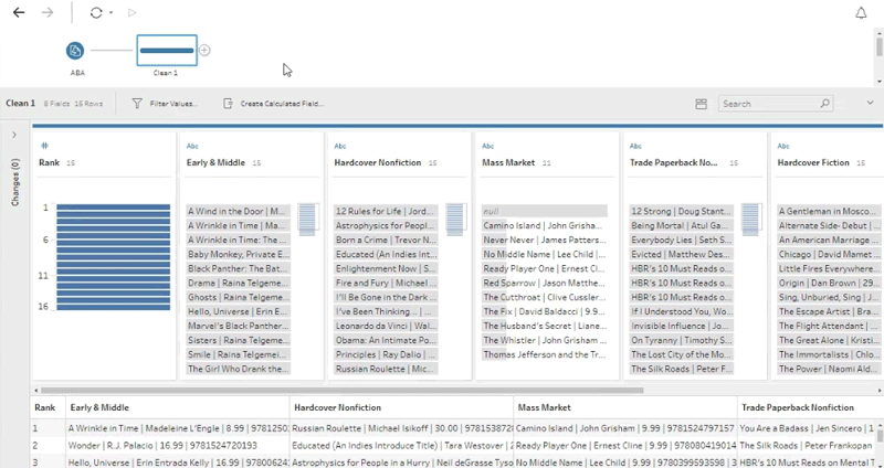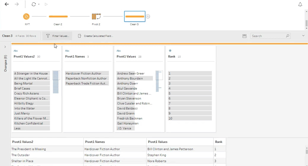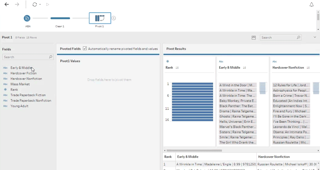 新增一个转置步骤。然后选择包含同一信息的字段名称,例如选中所有包含 Author 的字段,并将它们转换为 Pivot Values 1。