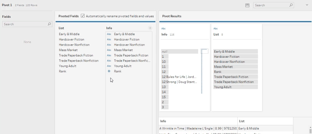 Tableau Prep 具有智能识别功能。如果一个新字段的所有内容都有一个共享值,它可以自动重命名转置的字段和值。