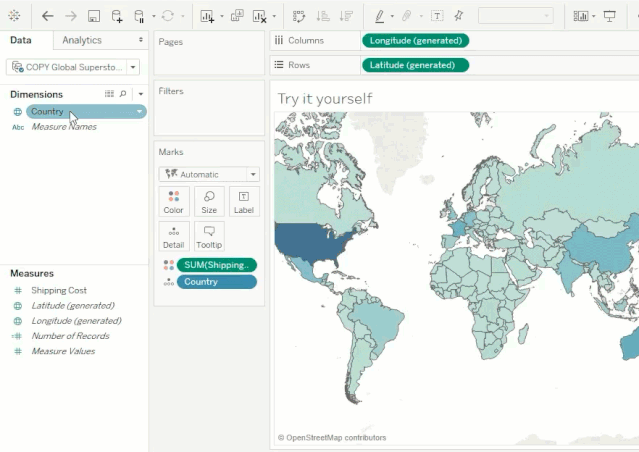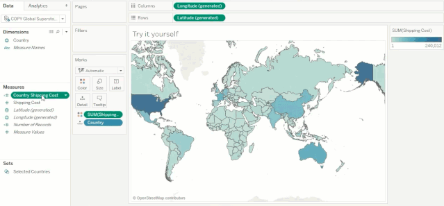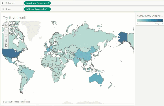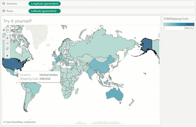 通过创建一个计算字段,只查看选定国家的运输成本,并将该计算拖放至标记卡的“颜色”上,将可以避免高成本国家的极端值影响。