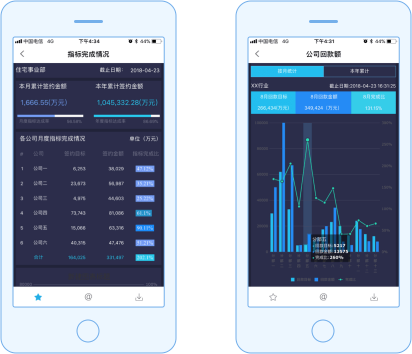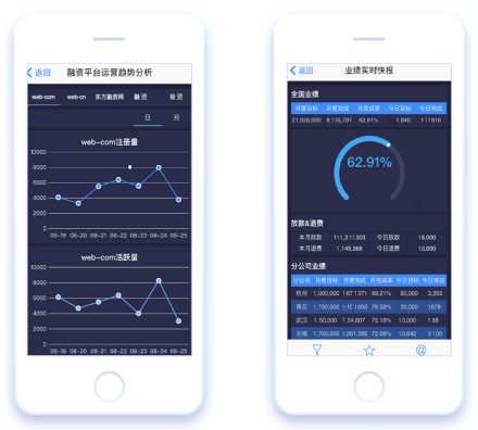 东方融资网为总部、分公司的中层以上管理者打造了移动业务数据分析平台提供了实时业务数据查询与分析,分公司运营数据对比分析,融资平台运营趋势分析等多张报表并且在移动端报表设计中充分考虑了布局、配色、交互等内容,报表美观易用。