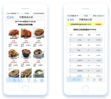 眉州东坡利用帆软移动数据分析平台对集团层面以及各个门店层面的菜品销售情况进行分析,让门店经理和厨师长清楚地了解所属门店的明星菜品与销量、明星菜品对总体销售额的贡献等数据,从而可以定期优化门店的推荐菜单。