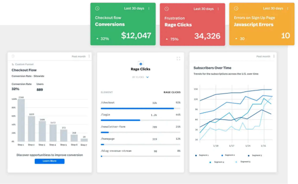 FullStory 是一款实用插件,它可以录制独立站消费者的操作行为,并对这些行为进行分类,卖家可以回放消费者在独立站内的全部操作过程,以及对其特定的行为进行监控,然后通过分析行为回放定位独立站的细节问题。