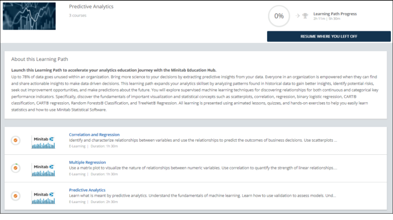 这就是为何 Minitab 创建自定进度的在线学习路径来配合资源和培训。员工将使用与他们所用工具一致且用当地语言编写的资料,按照自己的节奏学习。 真实世界的示例和练习为每节课提供了有价值的环境。用户学习知识并赢得信心,将其新技能直接应用于自己在工作中面临的挑战。通过专家打造的评估,确保您的员工正在学习的资料可帮助他们更好更高效地完成工作。