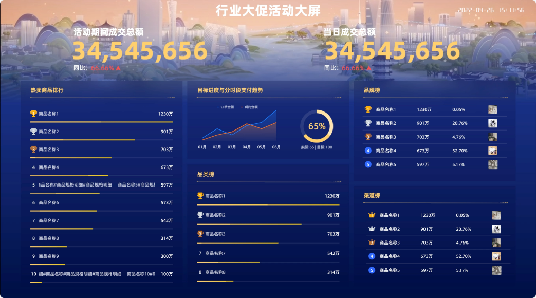 企业使用 Quick BI 将数据分析可视化和场景叙事相结合,通过外接屏幕进行展现或交互,可以实现 CXO 大盘、业务监控、以及对外PR等场景。Quick BI 全场景数据消费式 BI 平台,让数据在企业内充分流动和最大化消费。