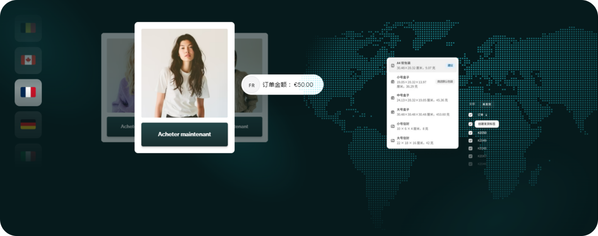 Shopify 简化了国际销售的复杂性,包括通过 Shopify Shipping 以更优惠价格更快配送产品, 以及通过 Shopify Markets 本地化购买体验。
