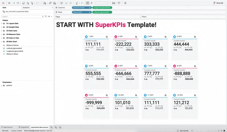 您完全拥有您的超级 KPI:获取每个组件,并根据您的喜好自定义它们。一切都已创建,可以在 Tableau 中轻松调整!在 Tableau 的超级 KPI 框架内创建您独特的设计!