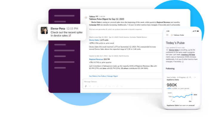 发现、关注和分享您的关键业务指标,以在友好且直观的体验中快速识别见解。Tableau Pulse 的下一代体验可为您提供易于理解的数据洞察,无论您在何处工作,无论是在 Slack、电子邮件、Salesforce 还是任何应用程序中。最好的部分? Tableau Pulse 主动为您提供见解,以便您能够及时做出决策。