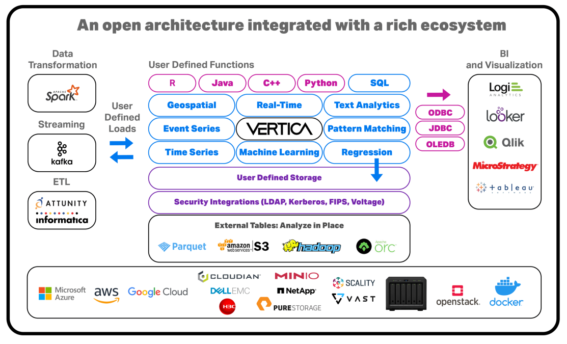 Vertica 可与您现有的数据基础设置结合使用。与最常用的硬件、公共云、开源工具、流动的编程语言和商业解决方案。