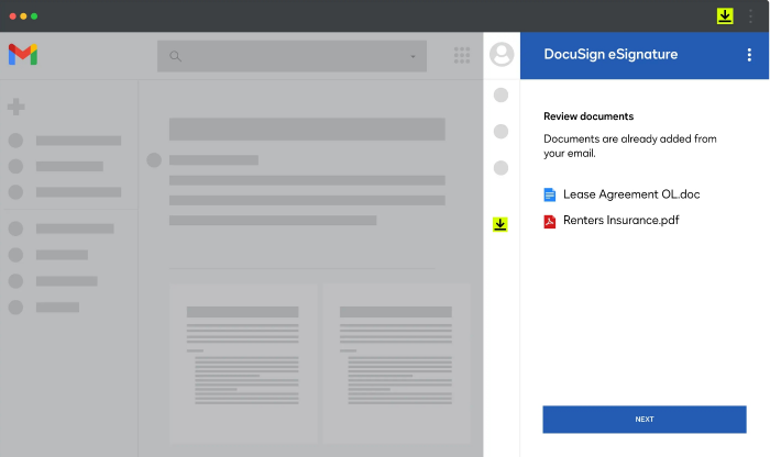 DocuSign eSignature 让您可以轻松地在 Gmail 中签署文档。只需点击 Google 插件侧栏中的 DocuSign 图标即可快速签署电子邮件附件,而无需离开 Gmail 收件箱。需要签名吗?只需点击几下即可发送带有签名请求的 Gmail。